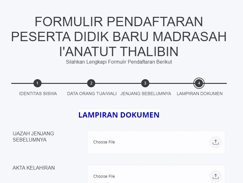 Pada Formulir Lampiran Dokumen, calon siswa diwajibkan mengunggah atau upload file yaitu Ijazah Jenjang Sebelumnya, Akta Kelahiran, Kartu Keluarga, dan KIP/KPS/KKS/PKH